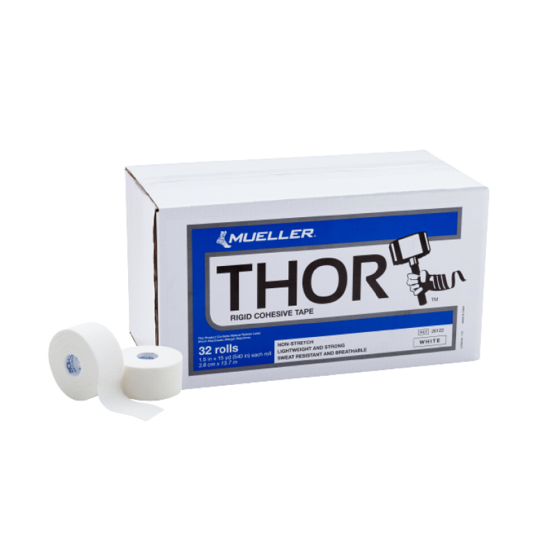 THOR™ Rigid Cohesive Tape offers the superior control and easy manipulation athletic trainers need. Use it with Mueller Tapewrap® Premium to create strong heel locks, precise figure-8s, and superb seating of strips.
